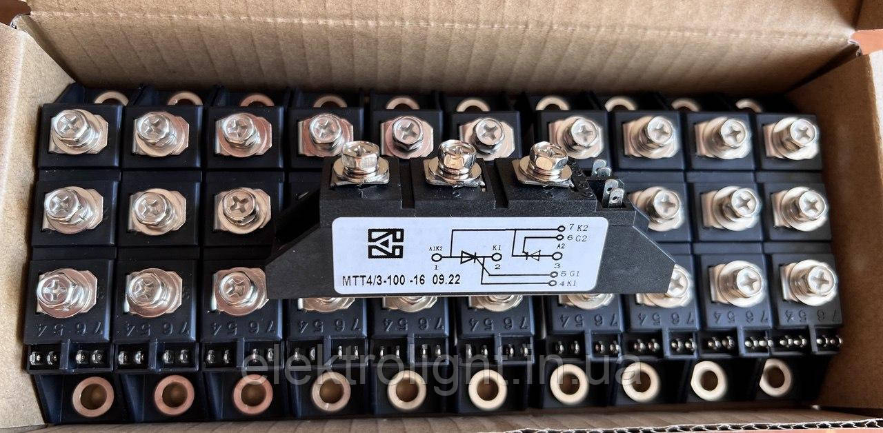 Модуль МТТ4/3-100-16 тиристорний силовий напівпровідниковий низькочастотний, що складається з двох послідовно з'єднаних кремнієвих дифузійних p-n-p-n тиристорів, включених за напівмостовою схемою.